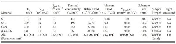 表I. 具有直径2英寸可扩展到直径大于6英寸衬底的常见半导体材料性能比较。粗体表示每个属性的最高值。部分数据来源于参考文献2。