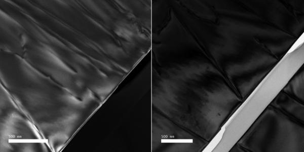 图6.(左)双束〈1 -100〉透射电子显微镜(TEM)图像(突出显示边缘型位错和堆垛层错)和(右)双束〈0002〉条件下的图像(突出显示螺旋型位错)。MME AlN薄膜厚度约为500 nm,与氢化物气相外延AlN衬底无法区分。