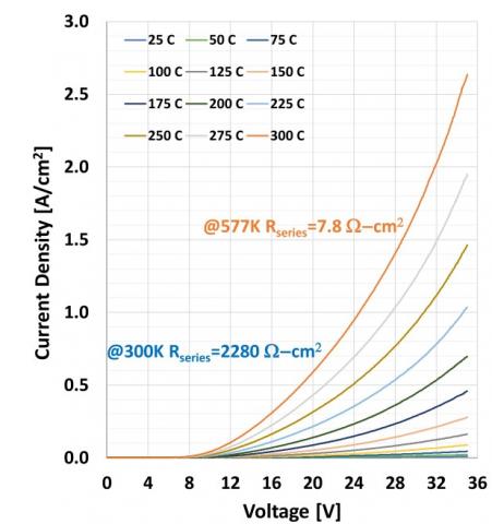 与n型接触的刻蚀相关的损伤阻碍了器件性能,使得已经很大的串联电阻(由于接触电阻)进一步增加。目前所有的二极管都受到串联电阻的主导,其值约为与原生薄膜接触的100倍。图7显示了这样一个特征,当在空气中从室温升至300℃时,串联电阻降低了约70倍,激活能为0.3 eV。然而,即使存在重大的接触挑战,已经可以实现约2.8A/cm²的相当可观的电流密度。