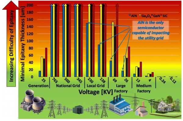 考虑已经商业化的2英寸或更大晶圆的所有半导体材料,AlN在所有主要材料优值(FOM)中排名前两位(见表I),这包括在临界电场、带隙能量、击穿电压、Baliga FOM(超所有其它材料10倍)和Johnson FOM均排名第一。AlN在热导率方面仅次于SiC,并且具有GaN饱和速度的93%,这在很大程度上决定了器件速度。使用在1016 cm-3电子浓度下的临界场强作为衡量标准,因为绝缘条件下的临界场是没有意义的,任何功能器件都需要一个适度掺杂的漂移层。在这些FOM中,临界电场至关重要。AlN的理论临界电场为15.4 MV/cm,远高于所有其他与功率器件相关的宽带隙半导体。这一高临界场降低了实际用于功率电子应用的外延厚度要求。AlN理论上可以获得惊人的约0.65 μm/kV的外延厚度-电压关系。例如,图1显示了在不同传输点达到美国公用电网所用电压所需的相对厚度。假设完全理论上的临界电场为15.4 MV/cm(半导体很少达到这个上限)和实用的外延厚度限制约为150 μm,AlN是唯一能够满足本地(138-230 kV)公用电网需求的半导体,并且可以轻松满足大中型工厂规模电网的需求。未来智能电网的大部分目标约为4 kV,AlN只需2.5 μm即可满足。