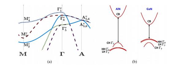 图3.(a)未受应力的纤锌矿AlN价带(无自旋)沿布里渊区内M、Γ和A对称点之间线性轨迹的密度泛函电子色散。在区域中心,分裂离带态Γv 1是单重简并的,而重空穴和轻空穴态Γv 6是双重简并的。(b)未受应力的纤锌矿AlN和GaN沿k⊥方向的定性电子色散。与GaN不同,AlN中最高的价带是分裂离带,其表现出较小的有效质量。自旋-轨道相互作用的引入解除了区域中心重空穴和轻空穴带的简并,导致单重简并态Γv;1 7、Γv 9和Γv;2 7的出现。