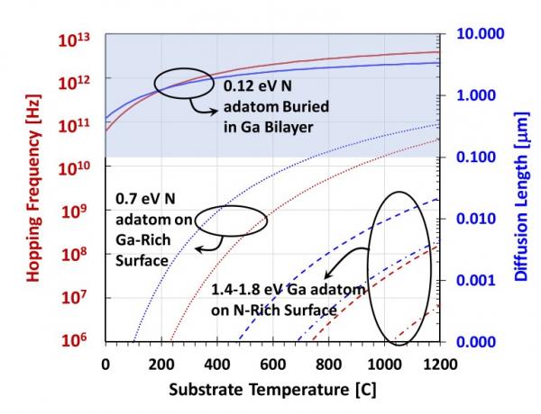 如图5所示,比较了具有0.12 eV和0.7 eV势垒的N原子与具有1.4 eV至1.8 eV势垒的Ga原子的跳跃率,结果表明:(a) 金属丰富的势垒比N丰富的势垒具有高约5-6个数量级的跳跃率;(b) 双层金属介导的扩散基本上不受温度影响。假设生长速率为1 μm/h,因此需要大约0.05秒的时间来覆盖一个原子层(生长1/4个GaN晶胞的时间),从ω跳跃率为1013 Hz和跳跃距离为a/2 = 0.159 nm的估计来看,即使在非常低的温度下,双层介导的扩散的扩散长度在大多数温度下仍保持多个μm。对于像MME这样的方法,它在干燥表面和极度金属丰富的表面之间振荡,扩散率是时间变化的,可以被认为是从较低的0.7 eV曲线移动到0.12 eV曲线,但仍然比典型的MOCVD或N丰富的MBE中的N丰富曲线高几个数量级。这个重要的结论重新定义了强键晶体的生长方式,即如果使用金属丰富的表面化学条件,就几乎没有必要使用高温。直接地说,表面动力学支持一个与普遍观点相反的结论:金属丰富的MBE表面的表面原子扩散比N丰富的CVD表面要多得多,但CVD系统利用的是气相扩散,而MBE则无法实现。