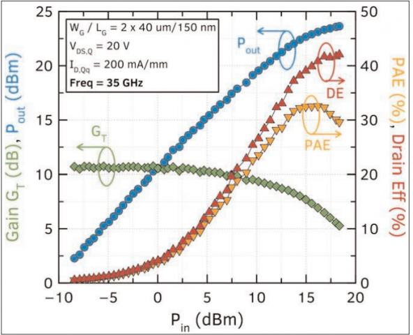 用于评估射频功率性能的大信号负载牵引测量(图2)结果显示,在调谐至峰值效率时,该器件的功率附加效率为32%,相关功率密度为2.68 W/mm,增益为7.3 dB。其漏极效率达到42%。此前学术演示的AlN/GaN/AlN HEMT器件曾在30 GHz频段范围内报告2.5 W/mm的功率密度。