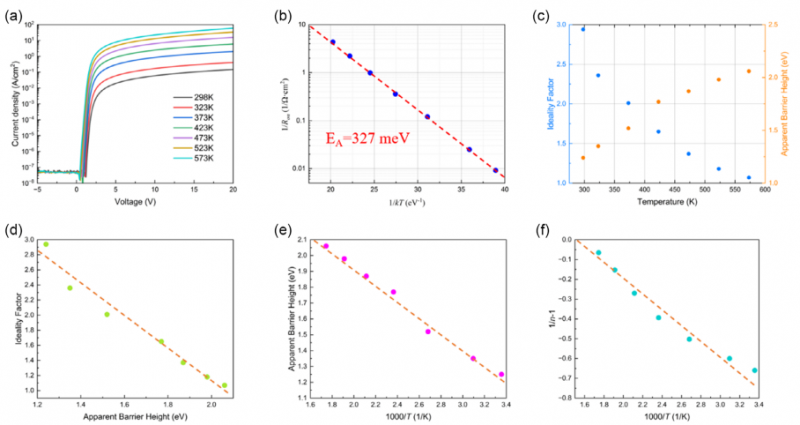 图3 | (a) 横向AlN肖特基二极管在298至573 K温度范围内的正向I-V特性曲线。(b) 导通电阻倒数随温度倒数的变化关系。(c) 横向AlN肖特基二极管的理想因子和表观势垒高度随温度的变化关系。(d) 理想因子n与表观势垒高度的关系。(e) 表观势垒高度与1000/T的关系。(f) 1/n−1与1000/T的关系。