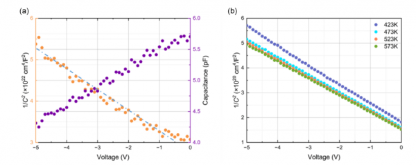 图4 | (a) 室温下横向AlN肖特基二极管的C-V特性曲线。(b) 在不同温度下测得的横向AlN肖特基二极管C-V特性曲线。