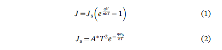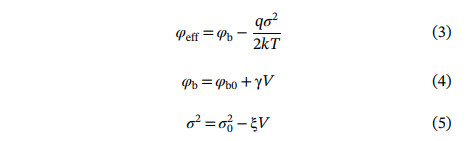 其中,φb0 和 σ₀ 为零偏压下的值,γ 和 ξ 表示电压诱导的肖特基势垒分布形变。基于以上公式,可推导出理想因子的表达式。