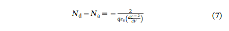 本文亦研究了横向肖特基二极管的C-V特性及其温度依赖性。根据C-V特性,净电荷浓度可由以下公式提取: