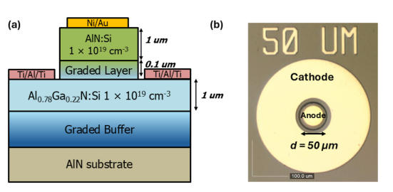 图1. 制备的准纵向AlN肖特基势垒二极管的(a)截面示意图与(b)俯视显微图像。