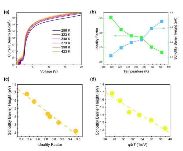 图3. 准纵向AlN肖特基势垒二极管的 (a) 温度依赖正向I-V特性;(b) 理想因子与肖特基势垒高度随温度的变化关系;(c) 肖特基势垒高度与理想因子的关系;(d) 肖特基势垒高度随 q/kT 的变化关系。