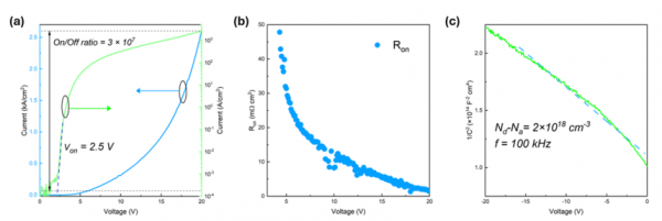 图2. 准纵向AlN肖特基势垒二极管的(a)线性坐标与半对数坐标下的正向I-V特性曲线;(b)提取的器件微分导通电阻RON随电压的变化关系;(c)器件的C-V特性(1/C²-V关系图)。