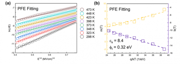 在区域A中,log J 与1/T呈线性关系,该特征在所有考虑的漏电机理中仅对应普尔-弗伦克尔发射过程。PFE是一种陷阱辅助的传输机制,其载流子密度与陷阱活化能呈指数关系。PFE引起的电流密度可表达为: