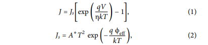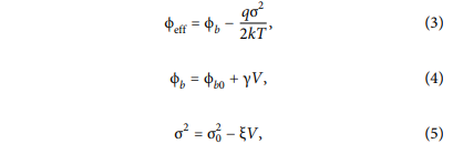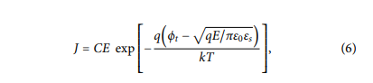 其中,E为有效电场,ϕt为电子从陷阱态发射的势垒高度,εs为相对介电常数,ε0为真空介电常数,C为比例常数,k为玻尔兹曼常数。在高电场作用下,原本局域于陷阱位置的电子可被激发至导带,从而形成反向漏电流。进入导带后,这些电子可能在半导体中漂移,直至被其他陷阱重新捕获。换言之,PFE模型描述了电场增强的陷阱态发射过程,该过程导致反向漏电流增大。