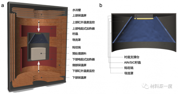 图2 (a)氮化铝晶体生长的热场结构示意图;(b)坩埚系统的内部构造示意图