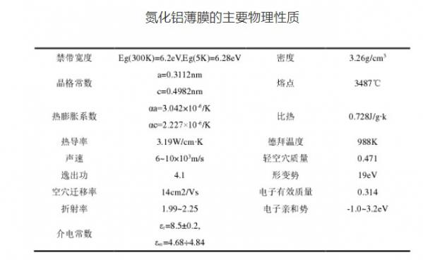 高质量的氮化铝薄膜还具有极高的超声传输速度、较小的声波损耗、相当大的压电耦合常数,与Si、GaAs相近的热膨胀系数等特点。AlN独特的性质使它在机械、微电子、光学以及电子元器件、声表面波器件(SAW)制造和高频宽带通信等领域有着广阔的应用前景。