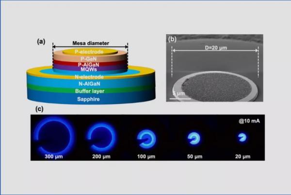 最近,由孙海定领导的中科大(USTC)的一个团队研究了275nm DUV micro-LED的光学和电气特性的尺寸依赖性,重点研究了直径(D)分别为300、200、100、50和20μm的制造器件。制造器件的示意图如图例所示。1(a)在文章的顶部。