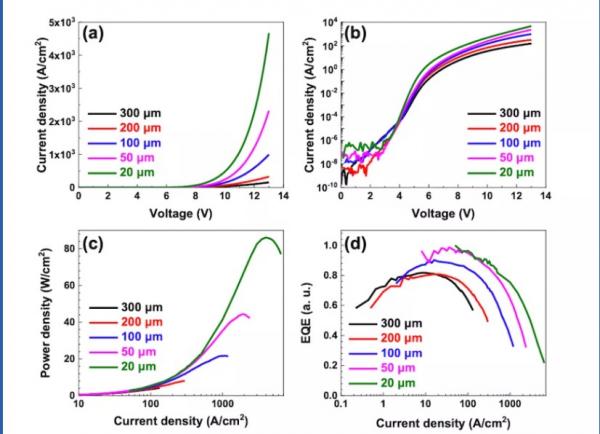 图2:(a)直径分别为20、50、100、200、300μm的LED芯片的J-V图和 (b)它们对数坐标的J-V图 (c)不同尺寸DUV LED的功率密度和 (d)它们外部量子效率(EQE)与电流密度的关系