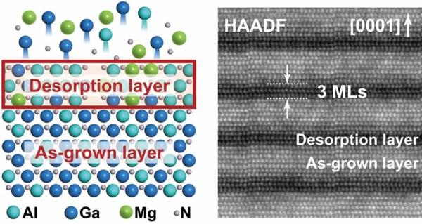 针对这一难题,北京大学人工微结构和介观物理国家重点实验室许福军副教授、沈波教授团队创新发展了一种“脱附控制超薄层外延”方法,成功实现了厚度为3个原子层(约为0.75 nm)的高Al组分AlGaN的可控外延(如图)。