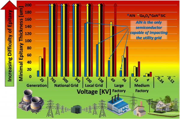 图1电网传输各节点所需的最小电压与器件厚度的关系(基于Tsao等人的理论击穿场强参数,Adv. Electron. Mater. 4 1600501 (2018))。对于半导体器件来说,厚度低于200μm被认为是合理的,但是,对于更高的电压传输应用,基于许多材料的器件厚度是非常不合理的,而氮化铝是唯一在230kV和138kV两个变电站级别应用中兼容的材料。即使对于较低的电压,氮化铝器件所需的厚度最少,有利于大规模减少器件/设备尺寸并提升其经济性。