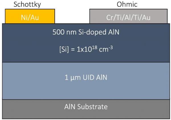 氮化铝(AlN)由于其超高带隙、高导热率(375W/mK)和高临界场(16MV/cm)而成为kV级电力电子器件领域极具前景的材料。这些优异特性使得其Baliga品质因子比功率器件领域使用的其他材料(如GaN和SiC)大30倍以上。此外,AlN具有非常高的热稳定性和化学稳定性,这使其成为极端环境下应用的理想材料。然而,AlN器件的发展一直受到限制,特别是在AlN上制备的肖特基二极管性能表现不佳,典型器件的理想因子大于5,且漏电流大、导通电阻高。此外,AlN肖特基接触的势垒高度预计大于2eV,且与所使用的金属无关,尽管现有文献报道的肖特基二极管中并没有观察到这个值(报道的范围集中在0.9到1.1eV)。此外,所有报道的肖特基势垒高度都与温度有关,表明存在接触不均匀性。