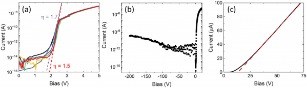 多个肖特基接触到AlN的室温I-V特性如图2所示。在反向偏置下,在-200V下观察到的电流强度小于1nA。在正向偏置中,2V附近观察到一个指数电流区。如图2(a)所示,该区域的理想因子在1.5-1.7之间。这证明电流主要源于热离子发射,正如理想的肖特基二极管。然而,对于远小于势垒高度的偏置,由于电子没有足够的能量来克服肖特基势垒,源于热离子发射的电子电流非常低。正因为热离子发射电流低,通过寄生通路(即位错和缺陷)的漏电流主导了该区域的I-V。随着偏置的增大和势垒高度的降低,热离子发射电流增大,最终超过漏电流。对所有制备的二极管,这均发生在正向偏置电压大约2V时。另一方面,当正向偏置电压大于20V时,I-V呈现出线性关系,这表明电流受到串联电阻的影响,如图2(c)所示。