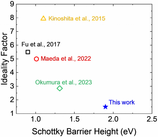 综上所述,AlN的肖特基接触理想因子仅为1.5,使用温度相关的I-V测得了接近2 eV的非温度相关的肖特基势垒高度。这些结果有力地证明了低偏置电压下的电流是由于热离子在肖特基势垒上发射形成。在高偏置电压下,电流主要受到掺Si层电阻率的抑制。通过阻抗谱法对空间电荷层电容进行隔离,从而证实了两个附加势垒的存在。此外,我们还观察到肖特基接触在高达650℃时仍保持稳定,并在冷却到室温时仍能保持整流特性。因此,AlN的肖特基接触可实现接近理想的二极管特性,而这一特性只能通过使用低位错密度的AlN单晶衬底与可控掺杂的AlN外延层相结合来实现。图6展示了AlN上肖特基二极管室温势垒高度与理想因子的函数关系,从而阐明了上述结果的重要性。尽管仍然存在诸多挑战,但本文证实了AlN材料基功率器件在极端环境下运行的巨大潜力。