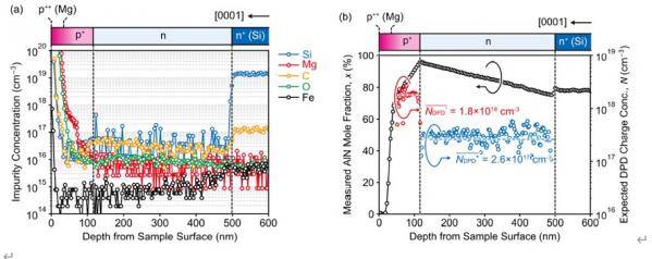 从应用和基础研究的角度来看,p-n二极管(PND)是半导体技术中的关键部件。然而,对于AlN摩尔组分超过30%的AlGaN来说,使用传统的杂质掺杂技术还无法实现具有理想电气特性的PND。在本研究中,我们证明了使用p-n结的p型层和n型层的无掺杂DPD技术,制备出接近理想品质因子的AlN基垂直p-n二极管。电容-电压(C-V)测量结果表明,净电荷浓度几乎与测量到的组分梯度所预期的相等。正向偏压电流密度-电压(J-V)特性显示,在较宽的温度范围内,理想因子约为2.0,这表明复合电流与典型的p-n二极管相似。对于反向偏压J-V特性,尽管缺少边缘终端结构,但估计的平行面击穿电场仍大于7 MV/cm。