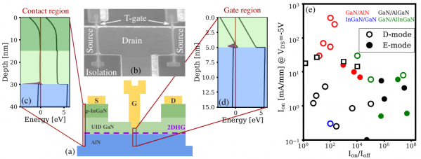 图8:加工完成的GaN/AlN pFET的(a)截面图和(b)SEM 图像,能带图突出显示了(c)接触区和(d)栅极区。请注意沟道区是完全未掺杂的。(e)已报道的III族氮化物pFET的基准图,GaN/AlN异质结构实现了最高导通电流。图表根据Bader等人的研究进行了修改和更新。