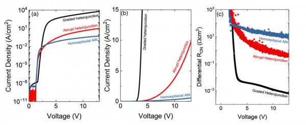图2. 制备的AlN肖特基势垒二极管的示意横截面:(a) 对照器件,(b) 突变异质结器件,(c) 梯度层异质结器件。