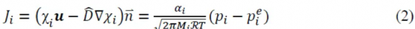 是蒸发/沉积表面的单位法向量,R是气体通用常数,χi、αᵢ、Mᵢ、pᵢ和pᵢe分别是物质i的摩尔浓度、粘附系数、分子量、分压和平衡压。