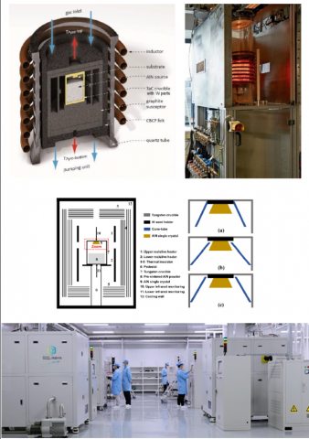 Figure 3: PVT growth reactors with hotzones by RF induction heating with a graphite setup [55] (top), and by two resistive heaters with a tungsten setup [105] (middle). Fully automatic tungsten-based PVT growth reactors for 2-inch bulk AlN crystal production (bottom), with courtesy of Ultratrend Technologies Co. Ltd.