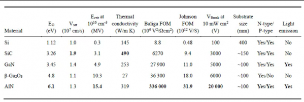 Table 1. Comparison of selected material properties of AlN with those of other commercially viable semiconductor materials [6]