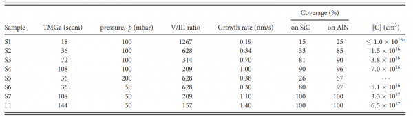 表I. 1080°C条件下生长于AlN与SiC衬底上的GaN层生长参数:TMGa流量、生长压力(p)、V/III比值、生长速率,以及层间覆盖度与碳杂质浓度[C]