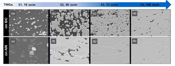 图1. 恒定压力100 mbar条件下,采用300 nm厚AlN缓冲层时不同三甲基镓(TMGa)流量生长的GaN层扫描电子显微镜(SEM)图像:(a)与(e)为样品S1(TMGa流量18 sccm);(b)与(f)为样品S2(TMGa流量36 sccm);(c)与(g)为样品S3(TMGa流量72 sccm);(d)与(h)为样品S4(TMGa流量108 sccm)。每组TMGa流量条件下,GaN层同步生长于SiC衬底(图(a)–(d))与AlN单晶衬底(图(e)–(h))。图(a)中的5 μm比例尺适用于所有图像。