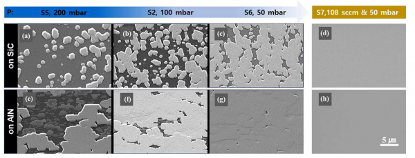 图2. 氮化镓(GaN)层在氮化铝(AlN)衬底上不同生长压力与36 sccm三甲基镓(TMGa)流量条件下生长的扫描电子显微镜(SEM)图像:(a)与(e)为样品S5(生长压力200 mbar);(b)与(f)为100 mbar压力条件;(c)与(g)为50 mbar压力条件。优化生长条件(50 mbar压力与108 sccm TMGa流量)下的GaN层形貌展示于(d)与(h)。每组条件下,GaN层均同步生长于碳化硅(SiC)衬底[图(a)–(d)]与氮化铝(AlN)衬底[图(e)–(h)]。图(h)中的5 μm比例尺适用于所有图像。