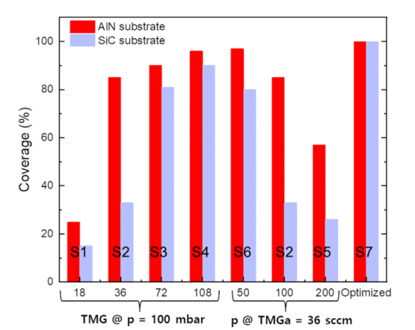 图3. 样品S1–S7在AlN与SiC衬底上生长的GaN层覆盖度对比