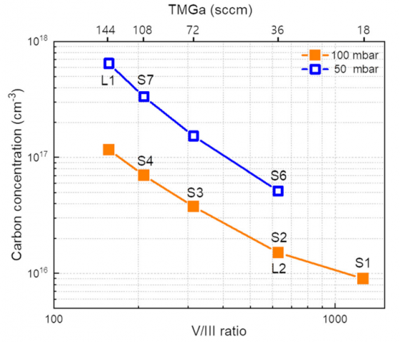 图4. 100 mbar(实心符号)与50 mbar(空心符号)压力条件下生长的GaN层碳浓度[C]随V/III比值(下横轴)及TMGa流量(上横轴)的变化关系