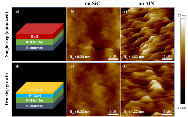 图5. 两种工艺条件下生长的150 nm厚GaN沟道层结构示意图与原子力显微镜(AFM)图像:(a)为采用条件S7生长的样品示意图,(d)为采用两步工艺生长的样品示意图(首层生长条件为L1,第二层生长条件为S2)。对应同步生长于SiC衬底上的结构AFM图像分别为(b)与(e),生长于AlN单晶衬底上的结构AFM图像分别为(c)与(f)。