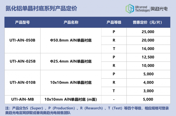 奥趋光电 AlN 单晶衬底全系列产品最新定价详情如下