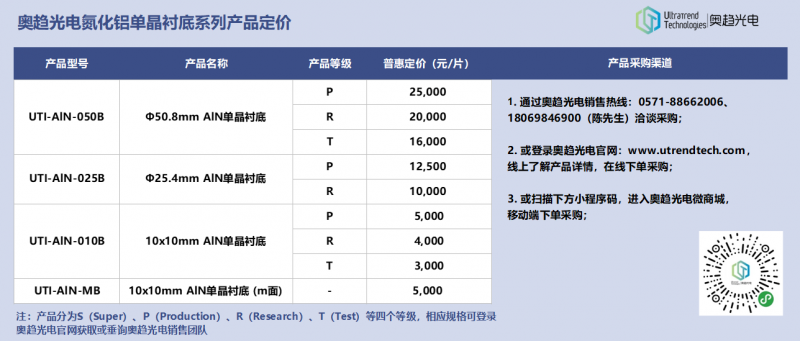 奥趋光电氮化铝单晶衬底系列产品定价及购买渠道